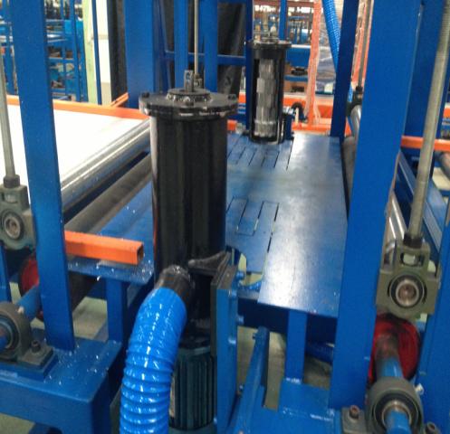 4.主機采用外包橡膠輥臥式復合,保護了彩鋼板漆面保護及夾芯板的加壓復合;