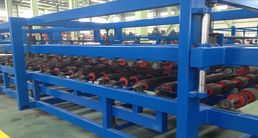 主要由瓦楞板壓型機和彩鋼復合機組成,可以一次性制做墻面彩鋼夾芯板或屋面彩鋼夾芯板,并且瓦楞板壓型機和復合機可以獨立生產。整條流水線壓型部分由彩鋼板開卷機、冷彎成型主機、切斷裝置組成,復合機部分由彩鋼板開卷,EPS板或巖棉板輸送,墻面淺波峰壓制,混合涂膠、加溫加壓、復合、平板卷邊、企口板翻邊、開槽、整邊、氣動夾緊、自動覆膜、自動切割、成品拖架組成;